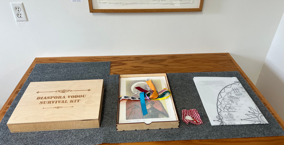 Coronado Print Room, Coronado printstudio’s gallery space is currently showing the solo exhibition, Pantéon: When the Saints Go Marching! by Vladimir Cybil Charlier. Premiering at the studio, Cybil’s most recent portfolio, titled Diaspora Vodou Survival Kit comprises an edition of 22 prints, as well as a table of content poster and a limited edition porcelain sculpture encapsulated in a handmade wooden box. This exhibition also highlights previous prints Cybil has published at Coronado printstudio, such as her screenprint, A Strange Bath, which aims to address the border conflict and political tension between the Dominican Republic and Haiti, and “Rose” All Language is a Longing for Home: an intimate portfolio of mixed-media linocuts depicting delicate symbology that explores the sacred African creation myth of Thezain.